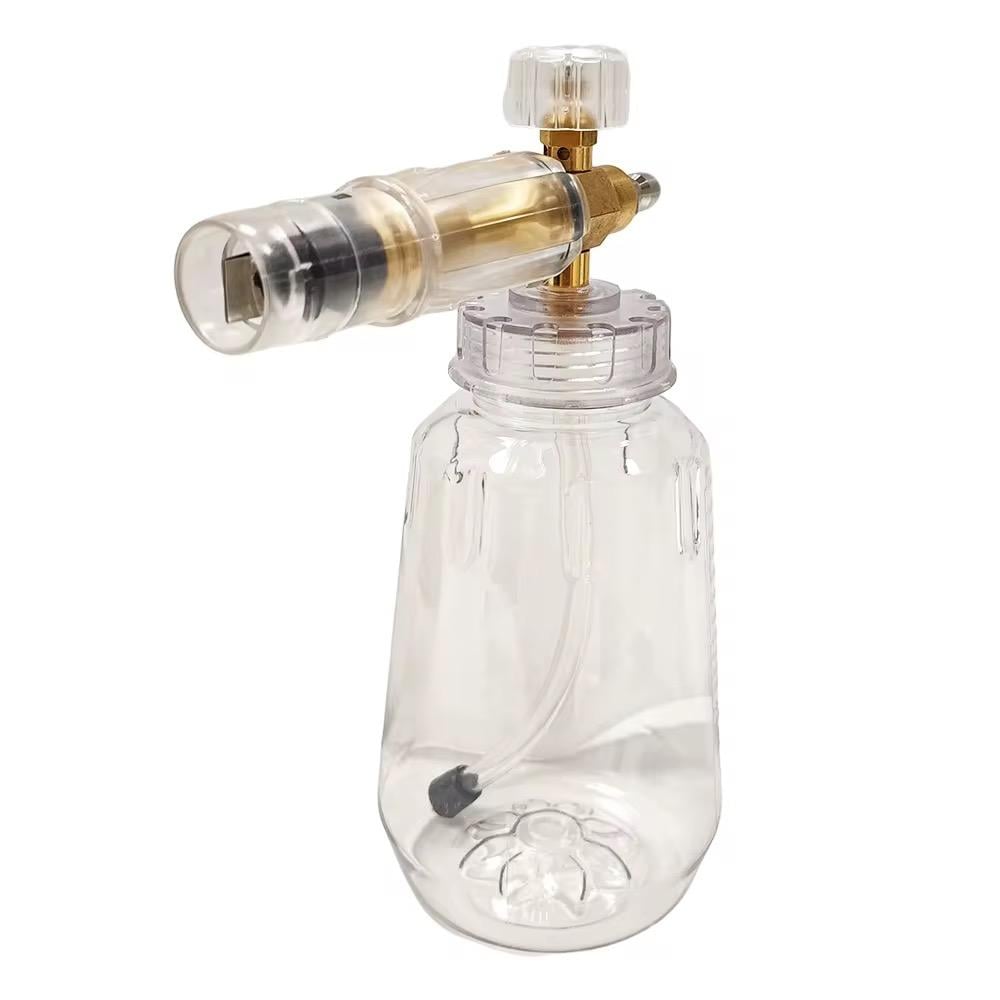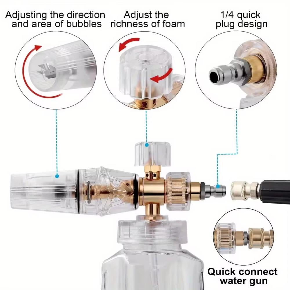 احصل على تجربة غسيل احترافية لسيارتك مع بخاخ الرغوة (فوم جن) المخصص لأجهزة الضغط العالي. صُمم الخزان الشفاف بسعة مناسبة لتعبئة الشامبو أو الصابون بسهولة، بينما يضمن رأس الفوم المعدني المزود بمنظم تحكم إخراج رغوة كثيفة ومتجانسة تغطي السيارة بالكامل. يساعدك على إزالة الأوساخ العالقة بسرعة وبدون خدوش، ويوفر استهلاك المنظفات والماء. مثالي لغسيل السيارات، الدراجات، النوافذ، الواجهات الأرضية وغيرها.