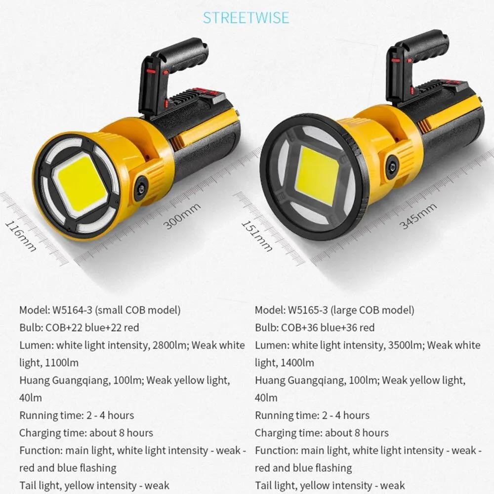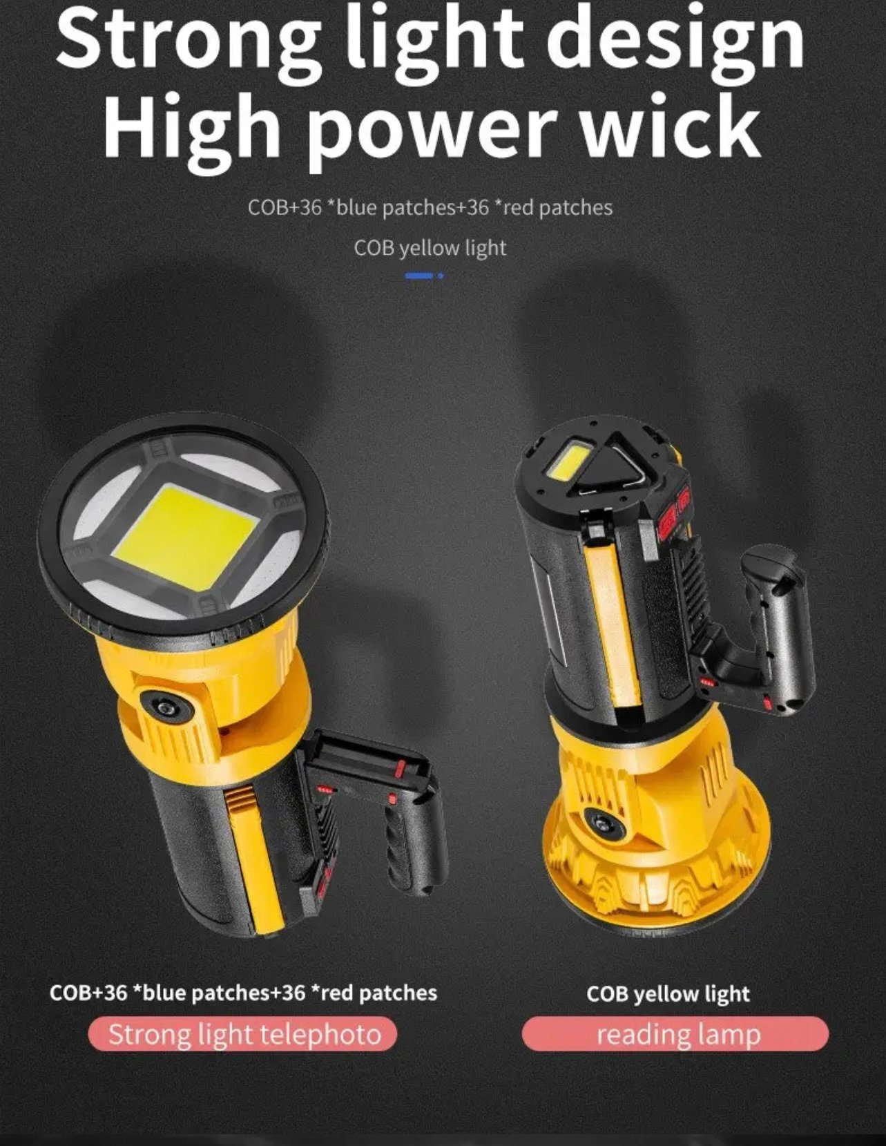 يحتوي المصباح اليدوي القابل لإعادة الشحن على 5 أوضاع سطوع منخفض/عالٍ للضوء الأبيض، ويمكن أن يعمل كمصباح عمل ومصباح يدوي وضوء تخييم وما إلى ذلك؛ يمكن أن يعمل ضوء الفلاش الأحمر والأزرق كضوء تحذير في الهواء الطلق يمكن استخدام وضع وميض الطوارئ لتنبيه الآخرين للمساعدة في حالات الطوارئ أو الإصلاحات المؤقتة مثل تعطل السيارات والمساعدة على جانب الطريق يمكن أن يعمل السطوع المنخفض/العالي للضوء الدافئ كضوء للقراءة.
